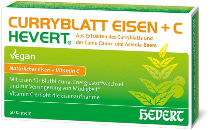 Da Curryblätter viel Eisen aufnehmen können, eignen sie sich hervorragend als Quelle für ein natürliches Eisenpräparat. Das pflanzliche Eisen wird in einem schonenden Verfahren extrahiert. Es liegt überwiegend in organisch gebundener Form vor und verhilft Curryblatt Eisen + C Hevert dadurch zu einer hohen Bioverfügbarkeit. Das Eisen kann also gut vom Körper aufgenommen und verwertet werden. Die Kombination mit natürlichem Vitamin C aus Camu Camu und Acerola unterstützt die Eisenaufnahme im Körper zusätzlich. Das in Deutschland hergestellte pflanzliche Präparat ist vegan, gut verträglich und frei von Farb- und Konservierungsstoffen. Curryblatt Eisen + C Hevert enthält 14 mg Eisen und 40 mg Vitamin C pro Kapsel. Um den Körper gut mit Eisen zu versorgen, genügt 1 Kapsel täglich. Ab Dezember 2021 ist Curryblatt Eisen + C Hevert (60 Kapseln, PZN 17444296) exklusiv in der Apotheke erhältlich.
